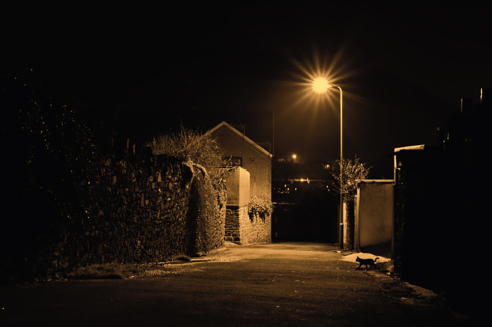 I was about halfway home when I noticed something odd. I was surrounded by what passed for darkness in Western society, but, of course, there was always enough electric light to keep the sky from being totally dark, and the street I was walking down, like every other street in town, had its share of streetlights. Still, there were some shadowy areas, mostly along the sides of houses. I was used to that.
